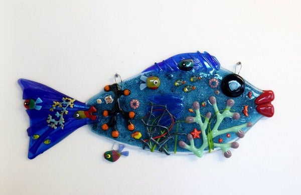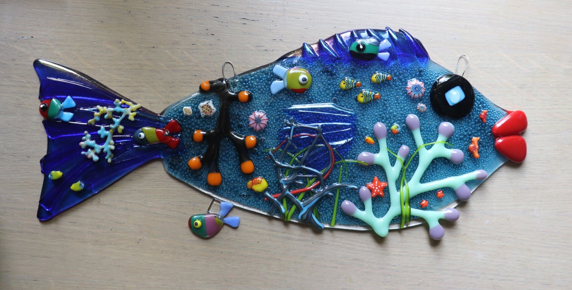 Wandpaneeltje in de vorm van een grote koperoxide vis met zeewier en kleine visjes