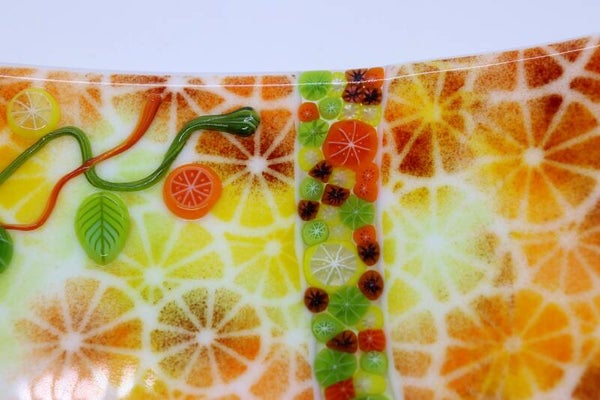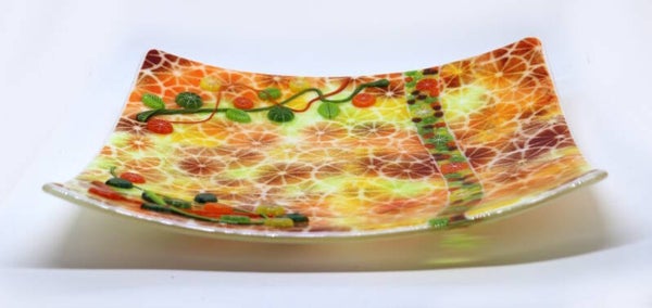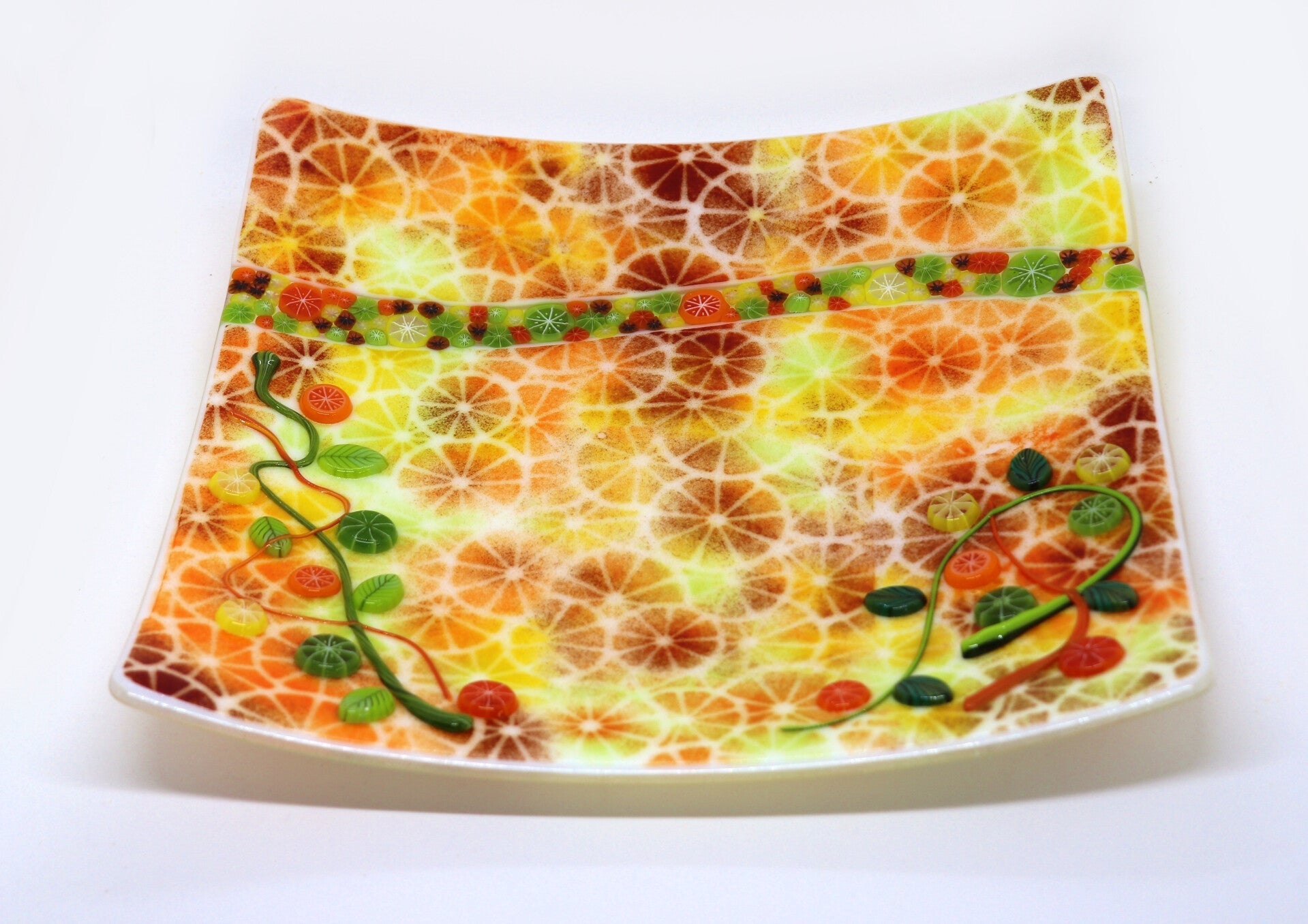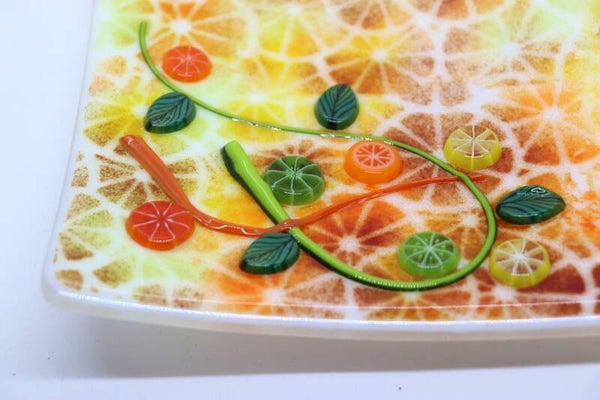 Grote vierkante schaal, witte ondergrond met een patroon van schijfjes citrusvruchten, en een decoratie van kleine blaadjes en citrusschijfjes van murrini, hij vraagt om gevuld te worden met sinaasappels en ander citrusfruit!