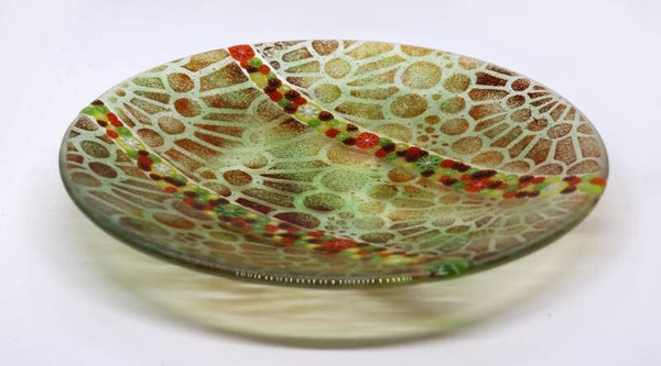 Grote ronde schaal met citrusmurrini en een abstract poederpatroon in groen en rood