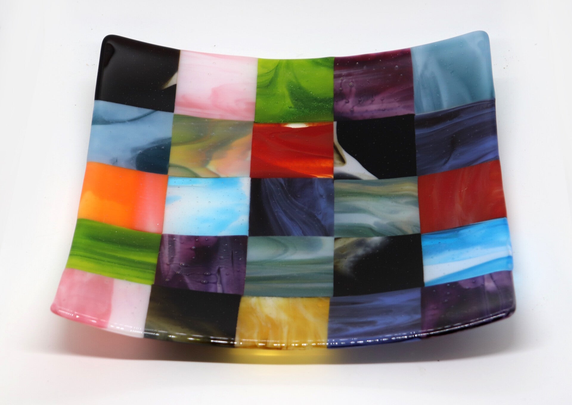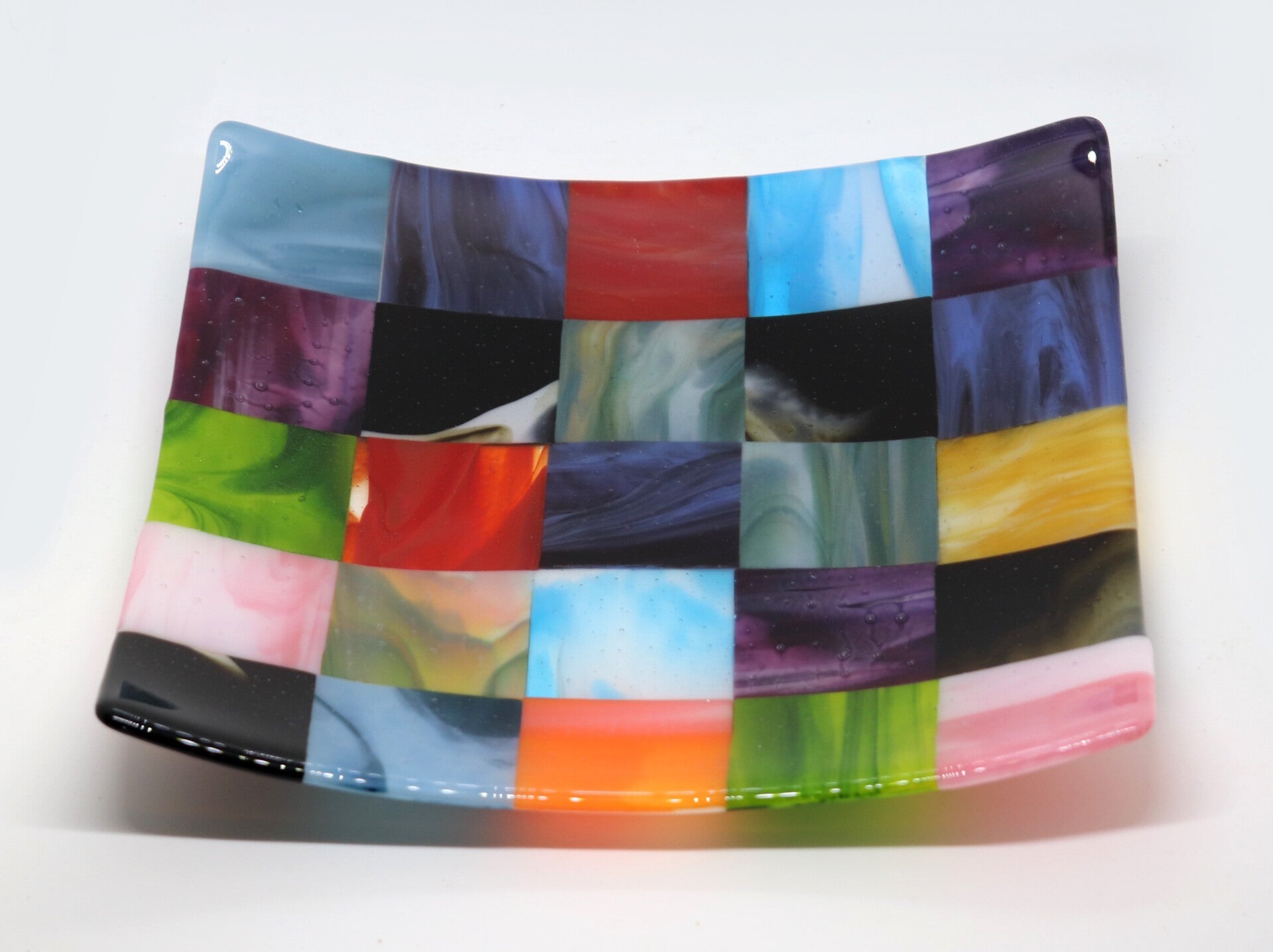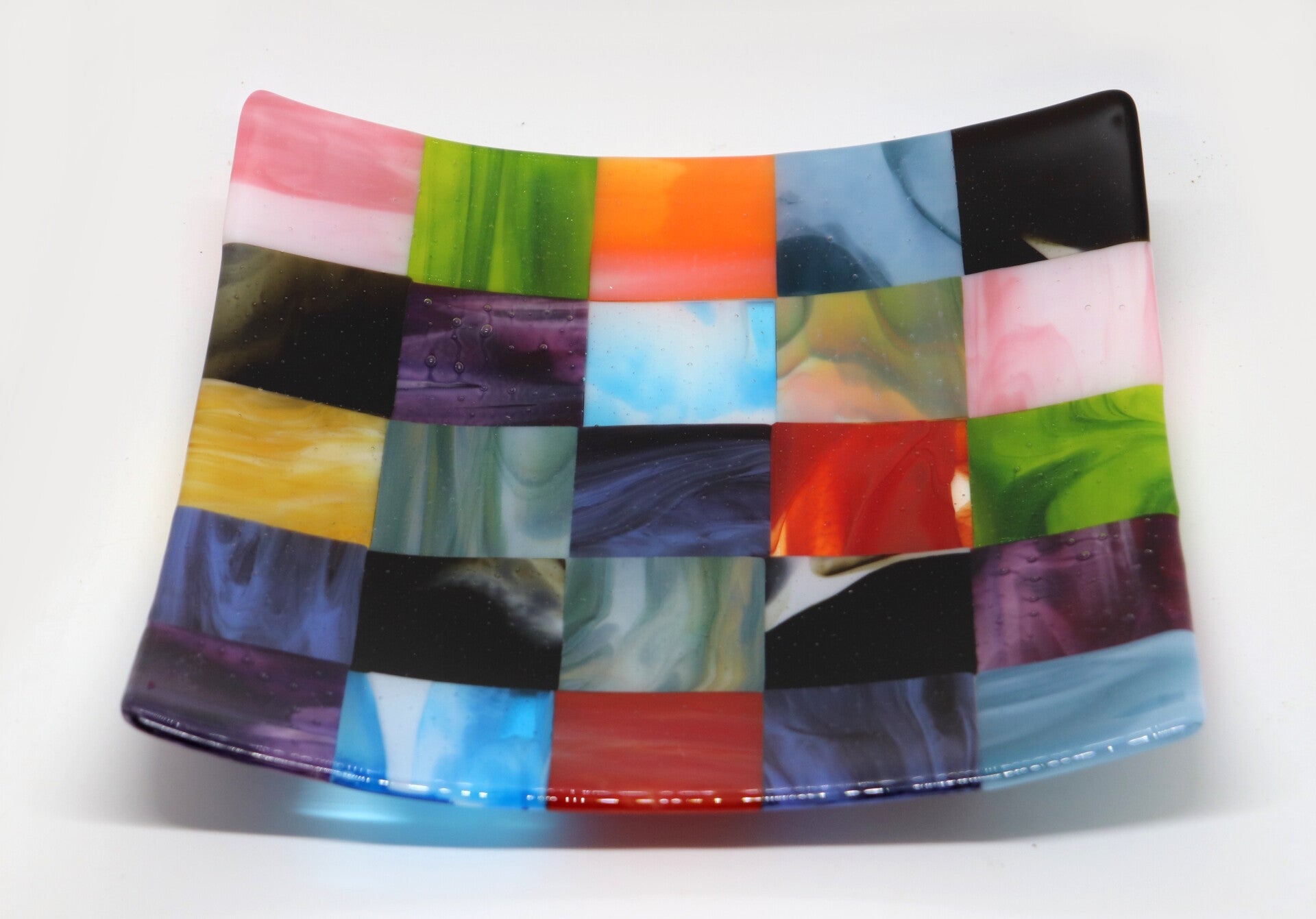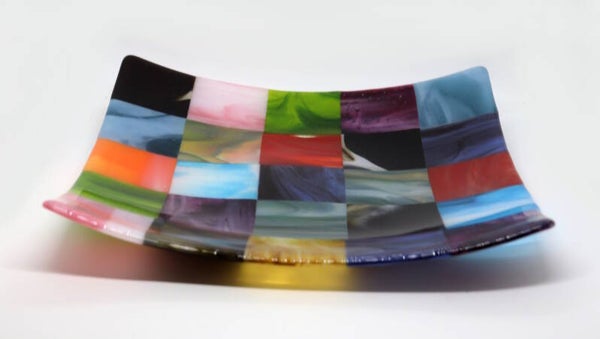 Grote vierkante schaal, met dambordpatroon van verschillende soorten gevlamd gekleurd glas