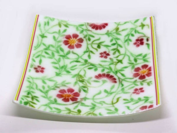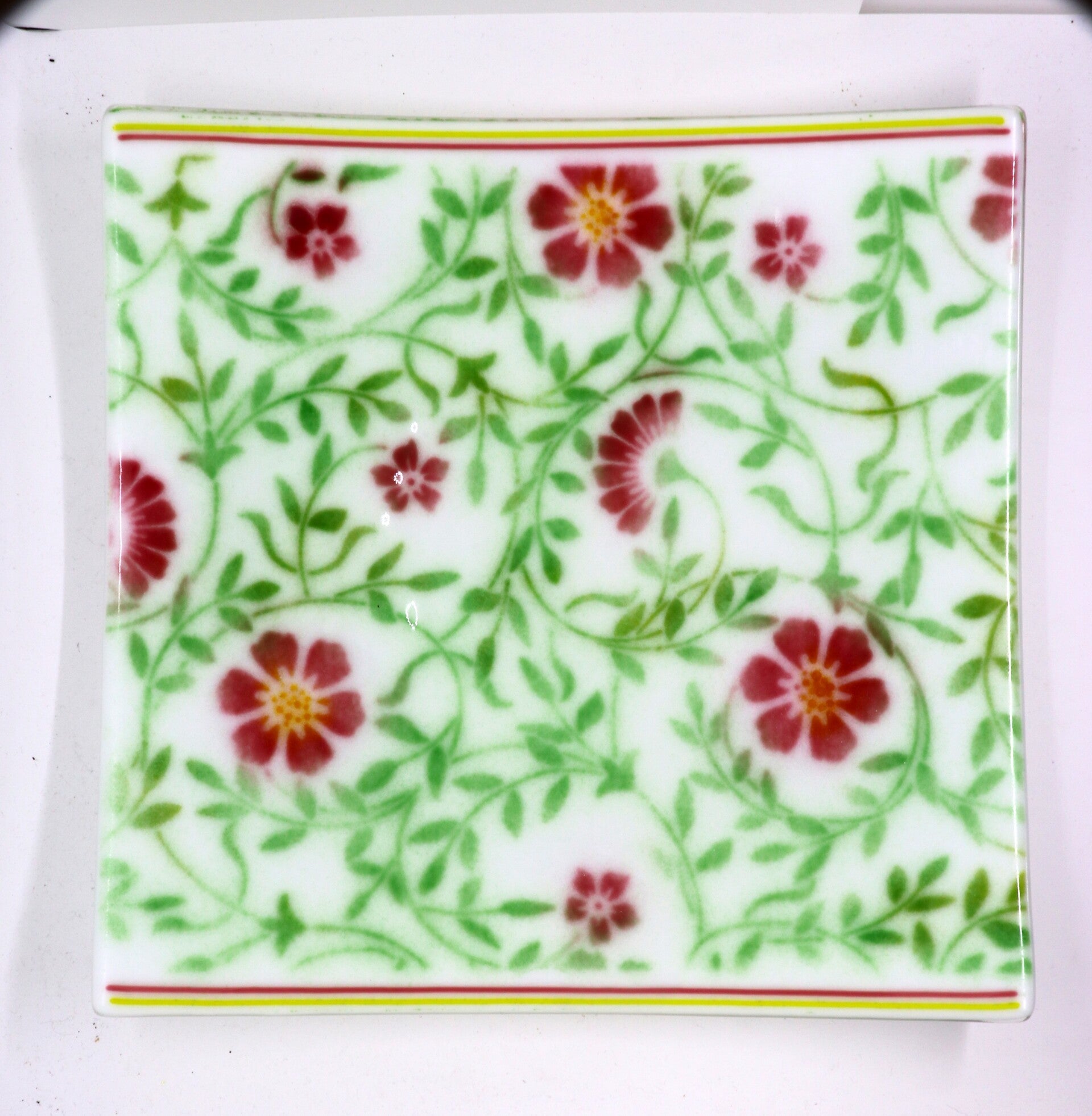 Grote vierkante schaal, met een patroon van roze bloemen en groene bladeren.