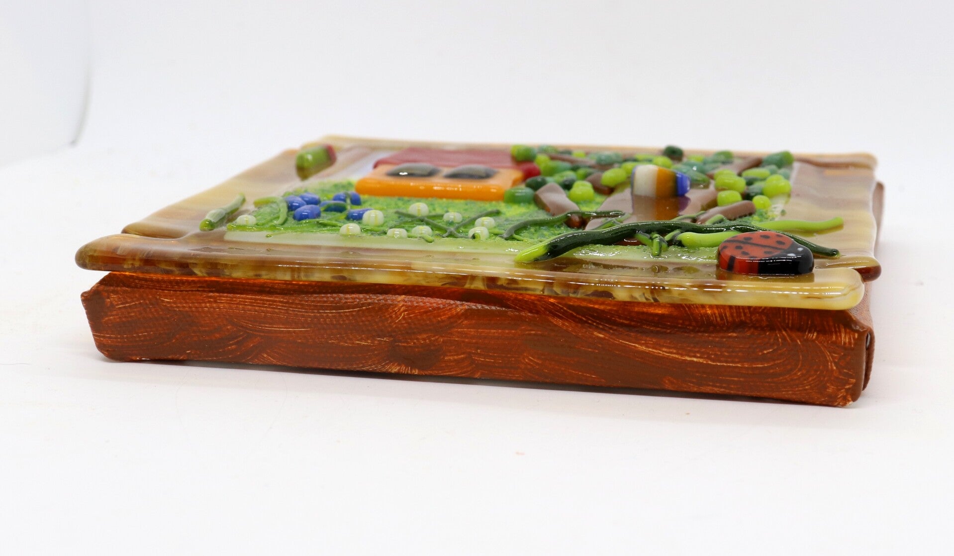 Vrolijk wandpaneeltje met bloemen, grasveld, boom met vogeltje en een huisje in de verte.