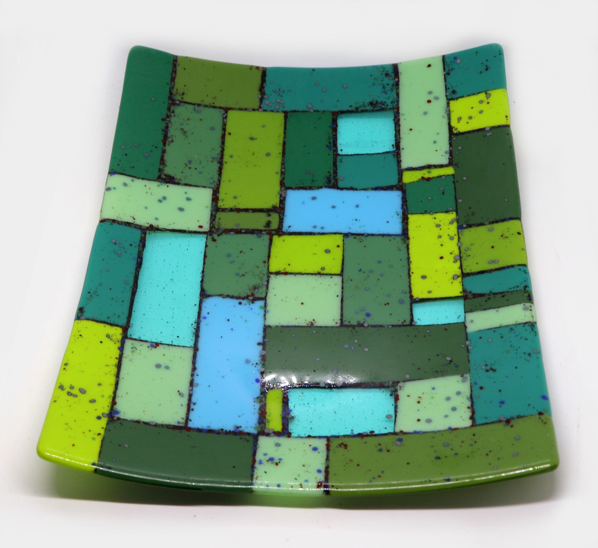 Rechthoekige schaal met abstract motief van opaak glas in overwegend groentinten met een paar doorkijkjes in blauw, een blikvanger op je tafel!