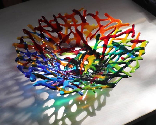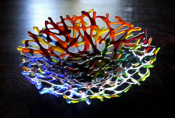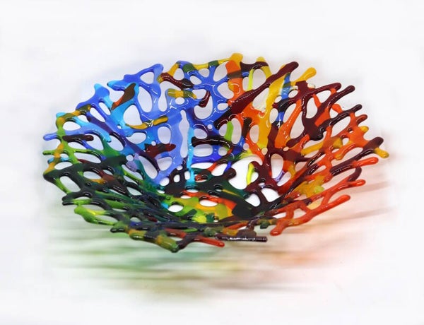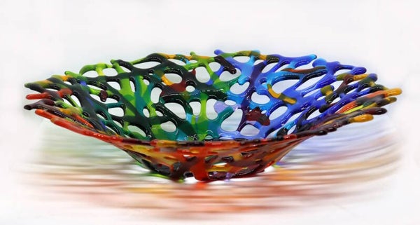 Ronde, opengewerkte veelkleurige schaal waar je vrolijk van wordt! Prachtig als het licht erop schijnt en de vormen en kleuren van het transparante glas gereflecteerd worden op de ondergrond.