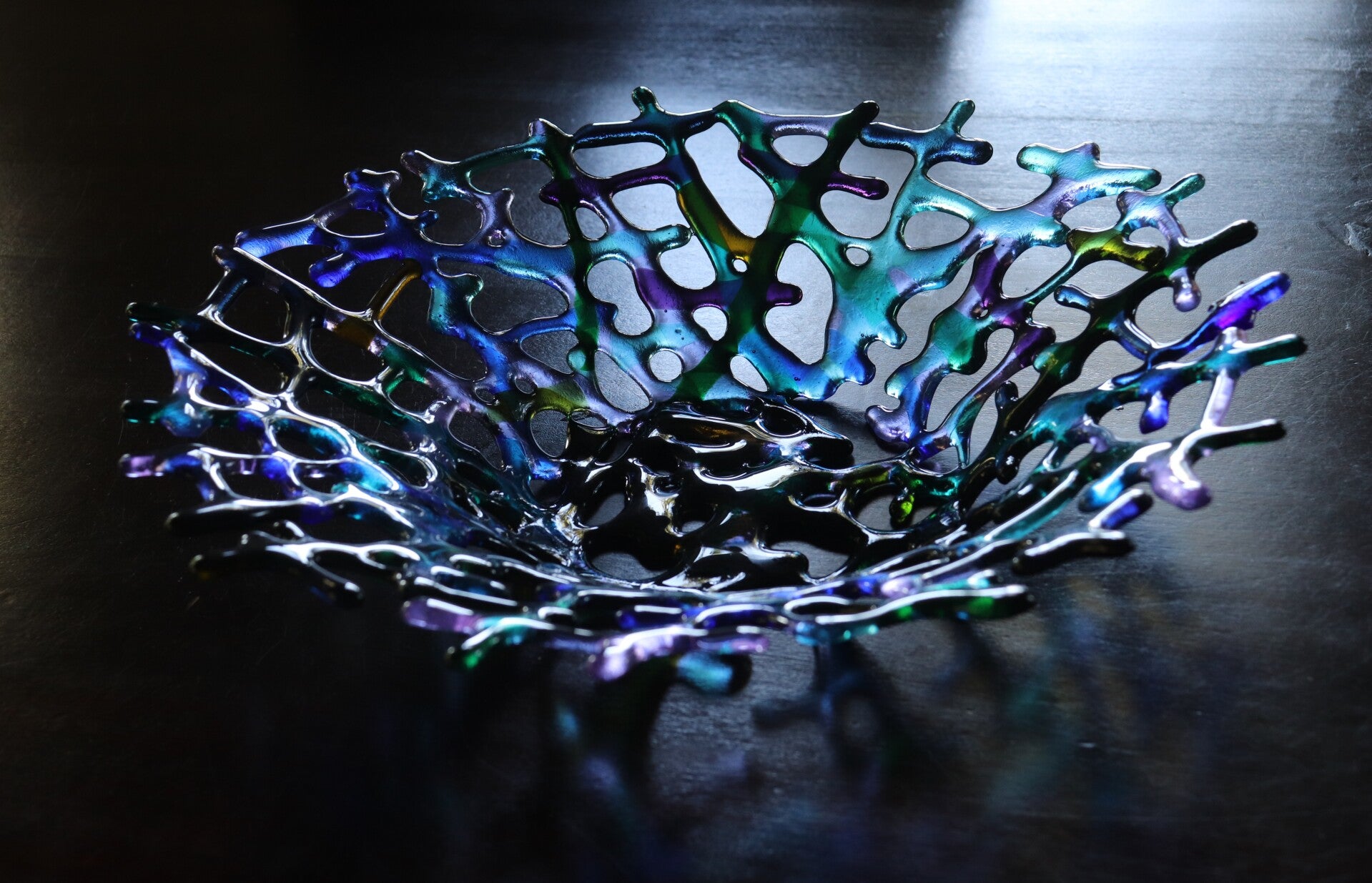 Ronde, opengewerkte schaal in blauw- en groentinten. Prachtig als het licht erop schijnt en de vormen en kleuren van het transparante glas gereflecteerd worden op de ondergrond.