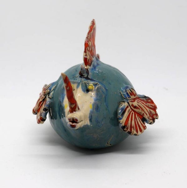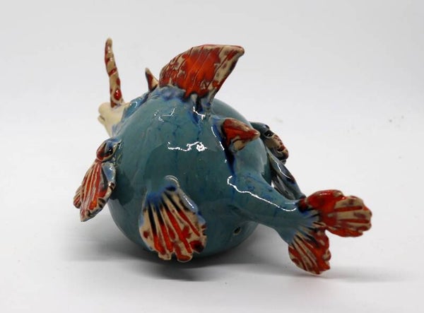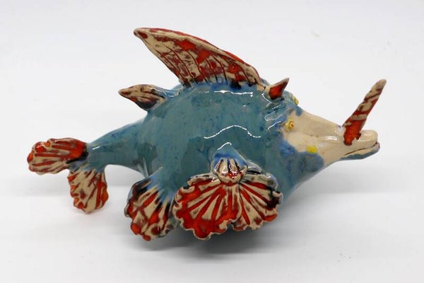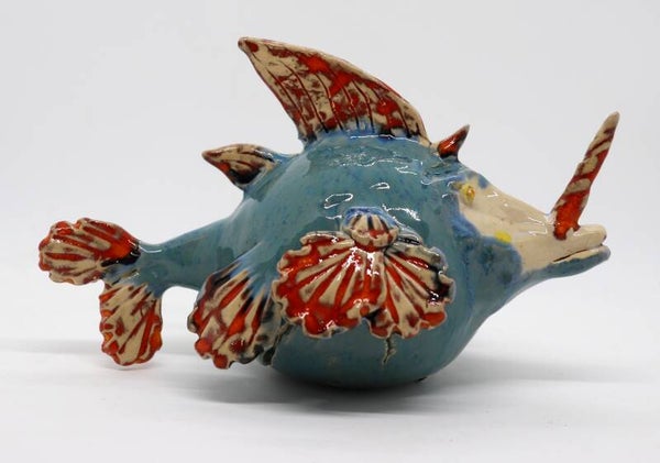aanbiddelijke aardewerken vis uit de serie ‘Bolbeesten’, met blauw en oranje effectglazuur