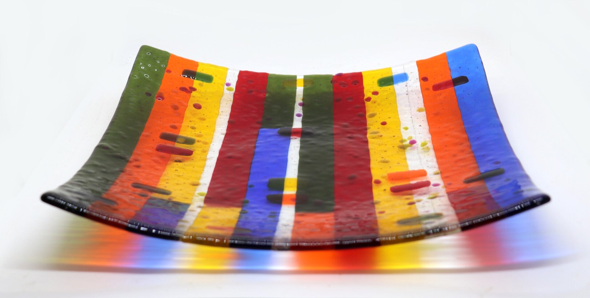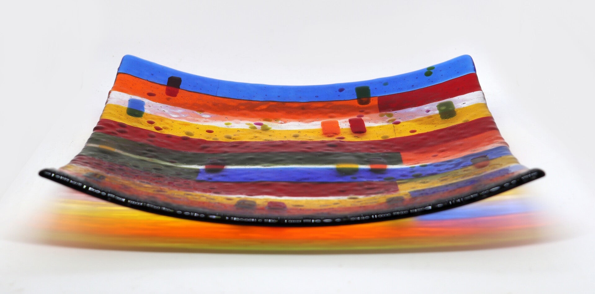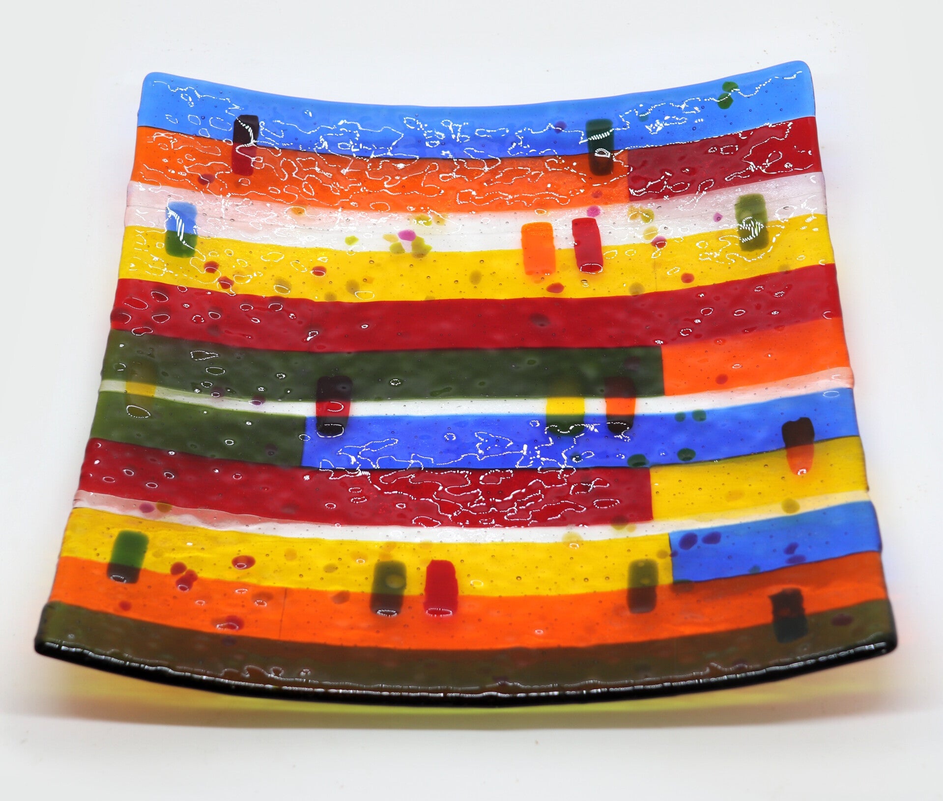 transparante vierkante glazen schaal met waterdruppeleffect, in groen, oranje, rood, blauw en geel