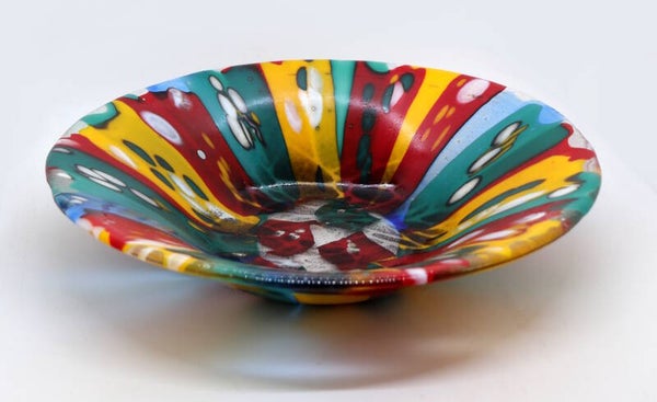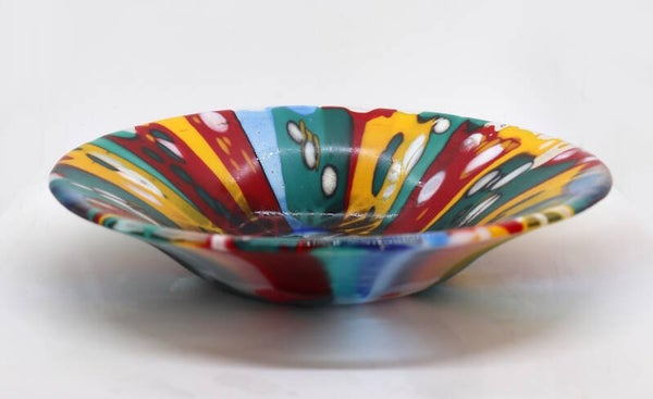 Grote ronde, diepe schaal van opaak glas in geel, blauwgroen, en rood met zwarte accenten. Het is alsof er een abstract schilder in de weer is geweest!