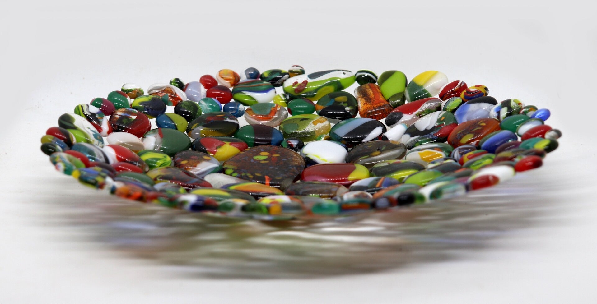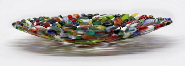 Ronde schaal gemaakt van veelkleurige glasparels (puddles)