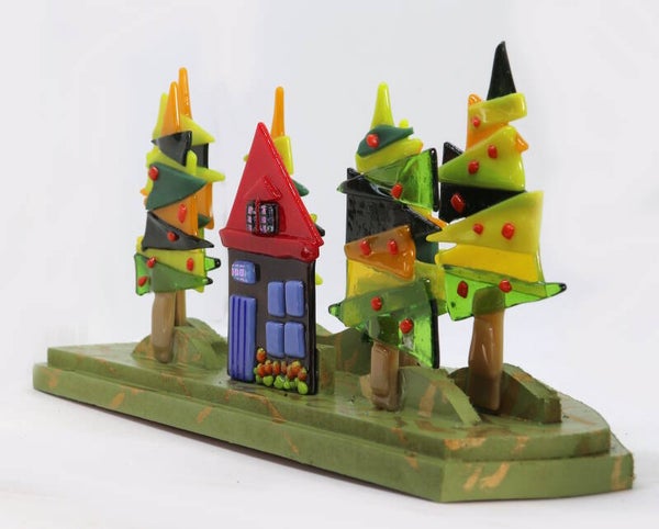 Tableau met huisje en bomen, Baoli en Bullseye glas op MDF