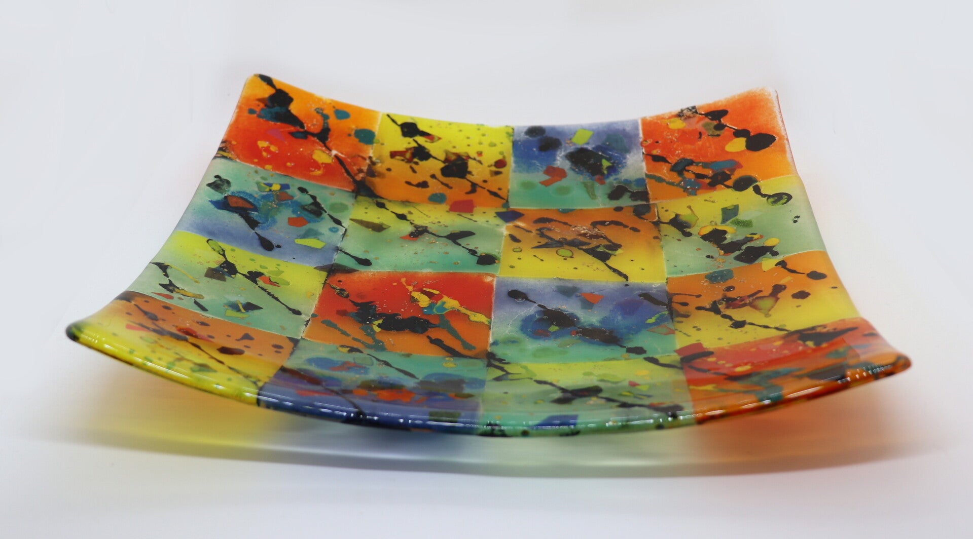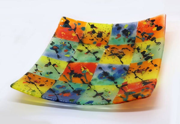 Feestelijke halftransparante schaal in kleurig dambordpatroon.