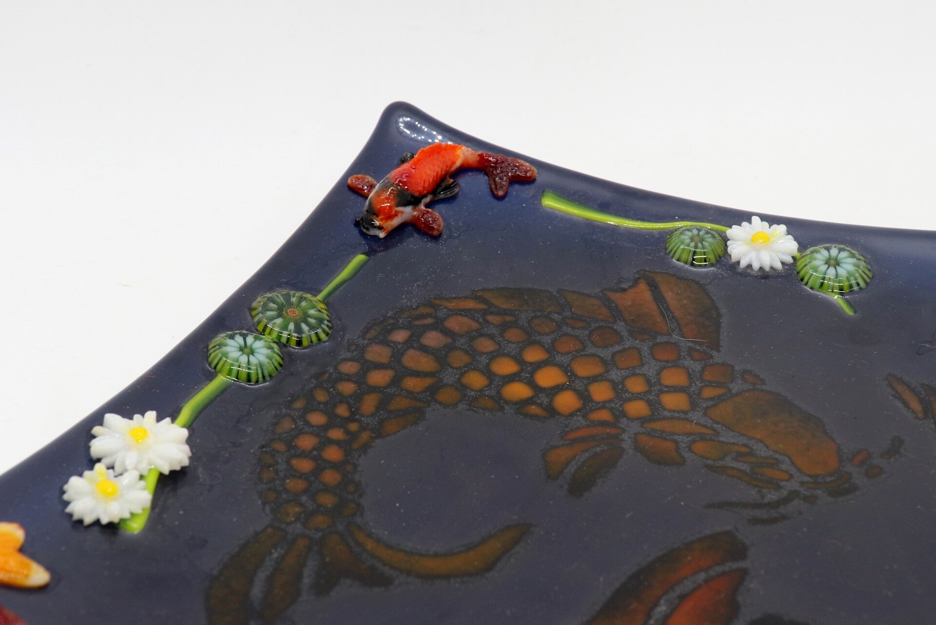 Een vijvertje voor op de tafel, halftransparant met een patroon van koi vissen en visjes en bloemen op de randen