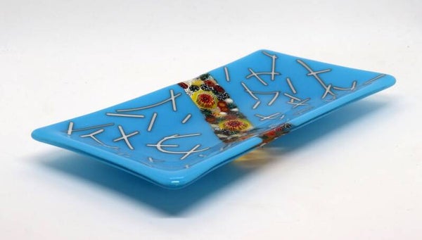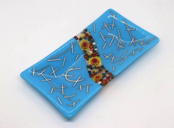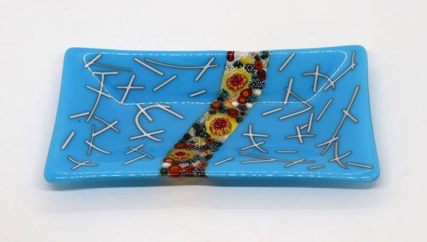 Schaal in vrolijk blauw met creme sliertjes en een stroom murrini in het midden