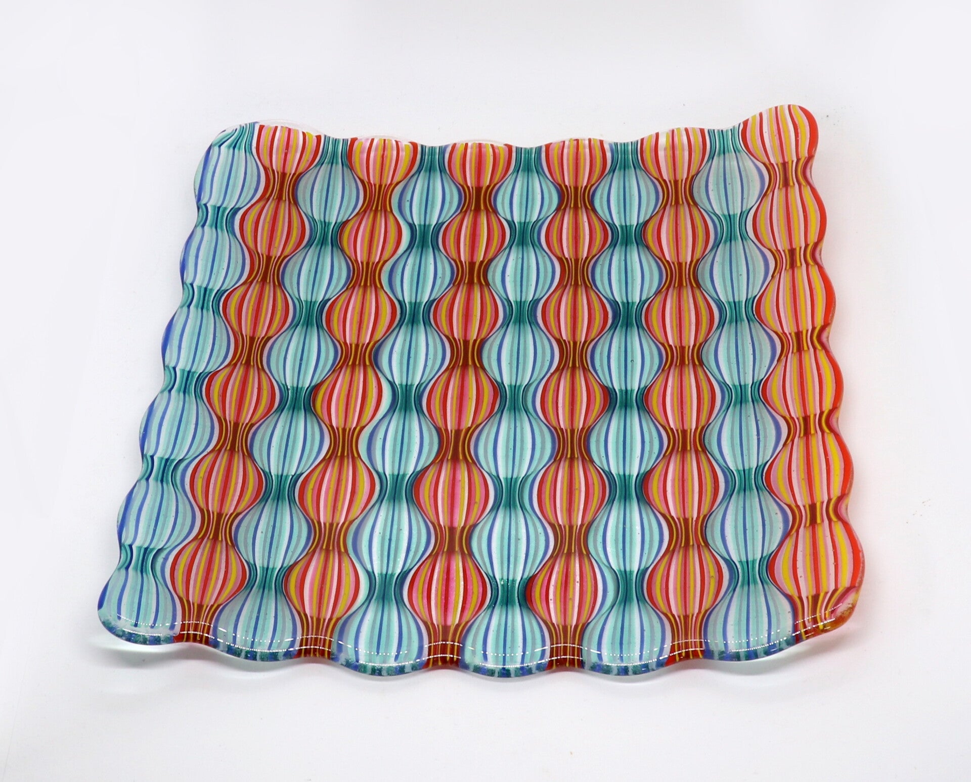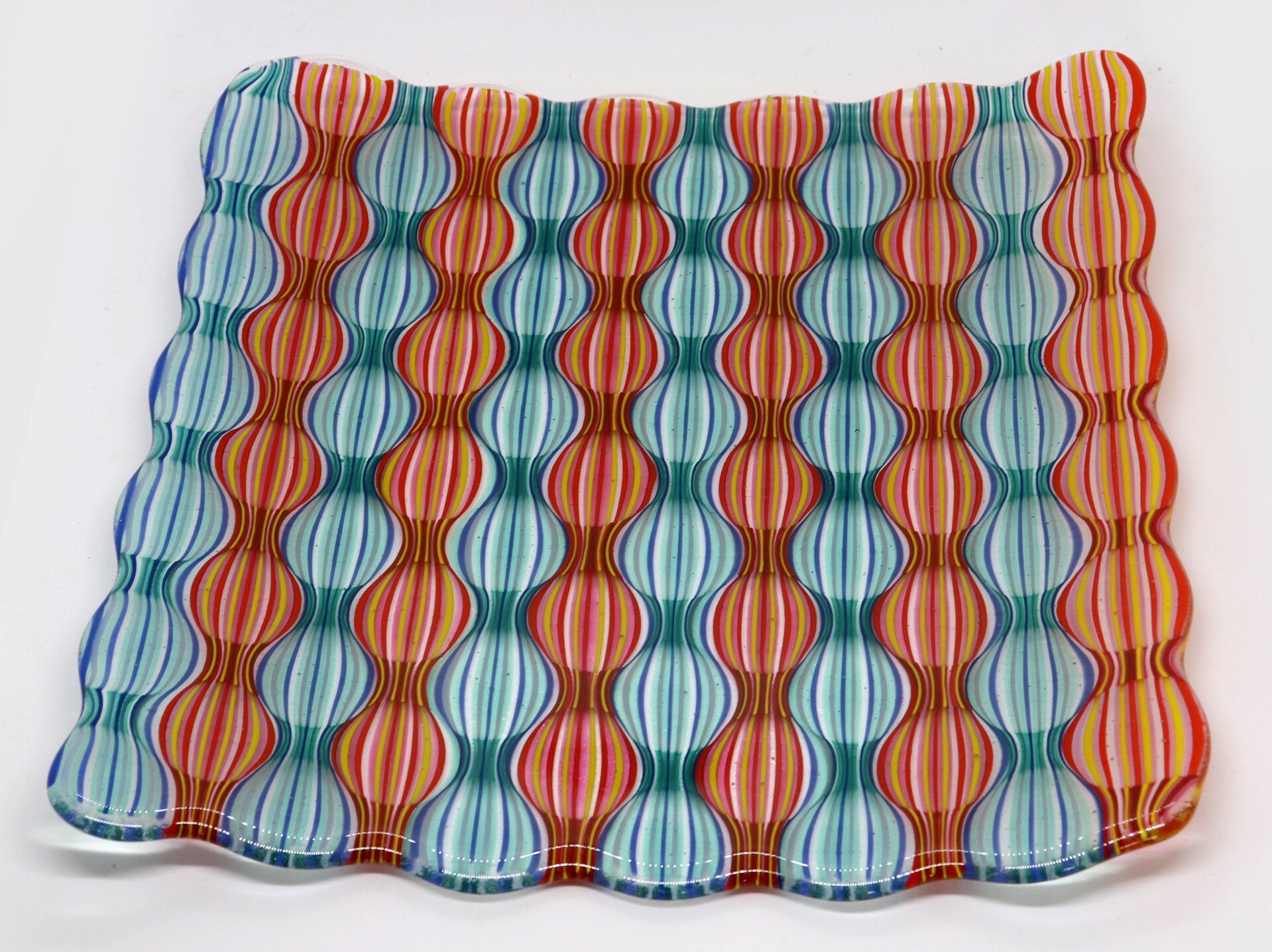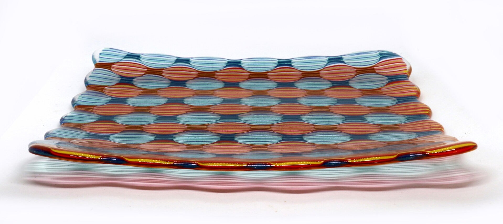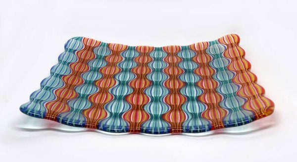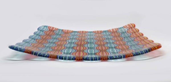 Grote vierkante schaal met optisch patroon in blauwe en rode banen, een echte blikvanger op je tafel!
