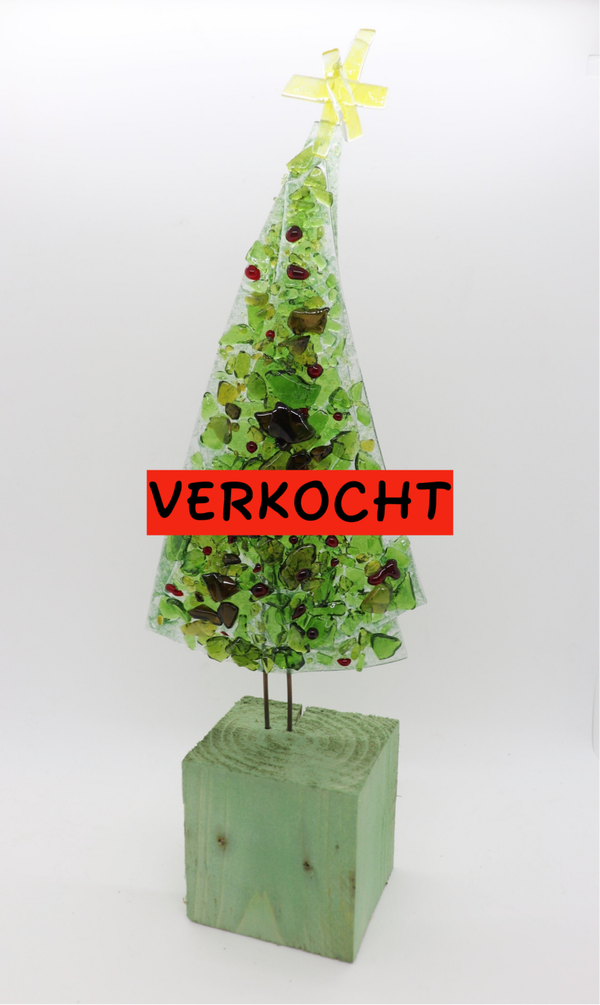 feestelijke transparante kerstboom van flessenglas op voet van gerecycled pallethout, prachtig in de vensterbank voor het raam overdag, of ’s avonds met een kaarsje erachter
