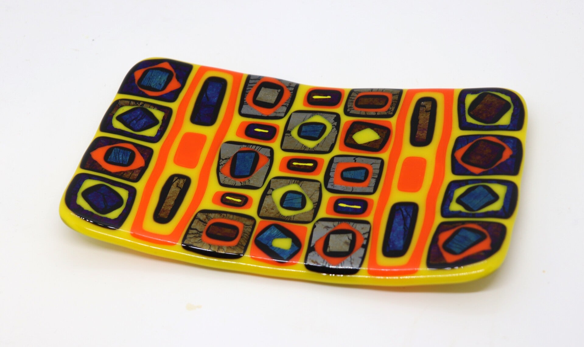 Rechthoekige schaal met een abstract patroon van oranje, geel en zwart met een retro uitstraling. Het iriserende laagje op de zwarte vlakken zorgt voor een verrassend beeld.